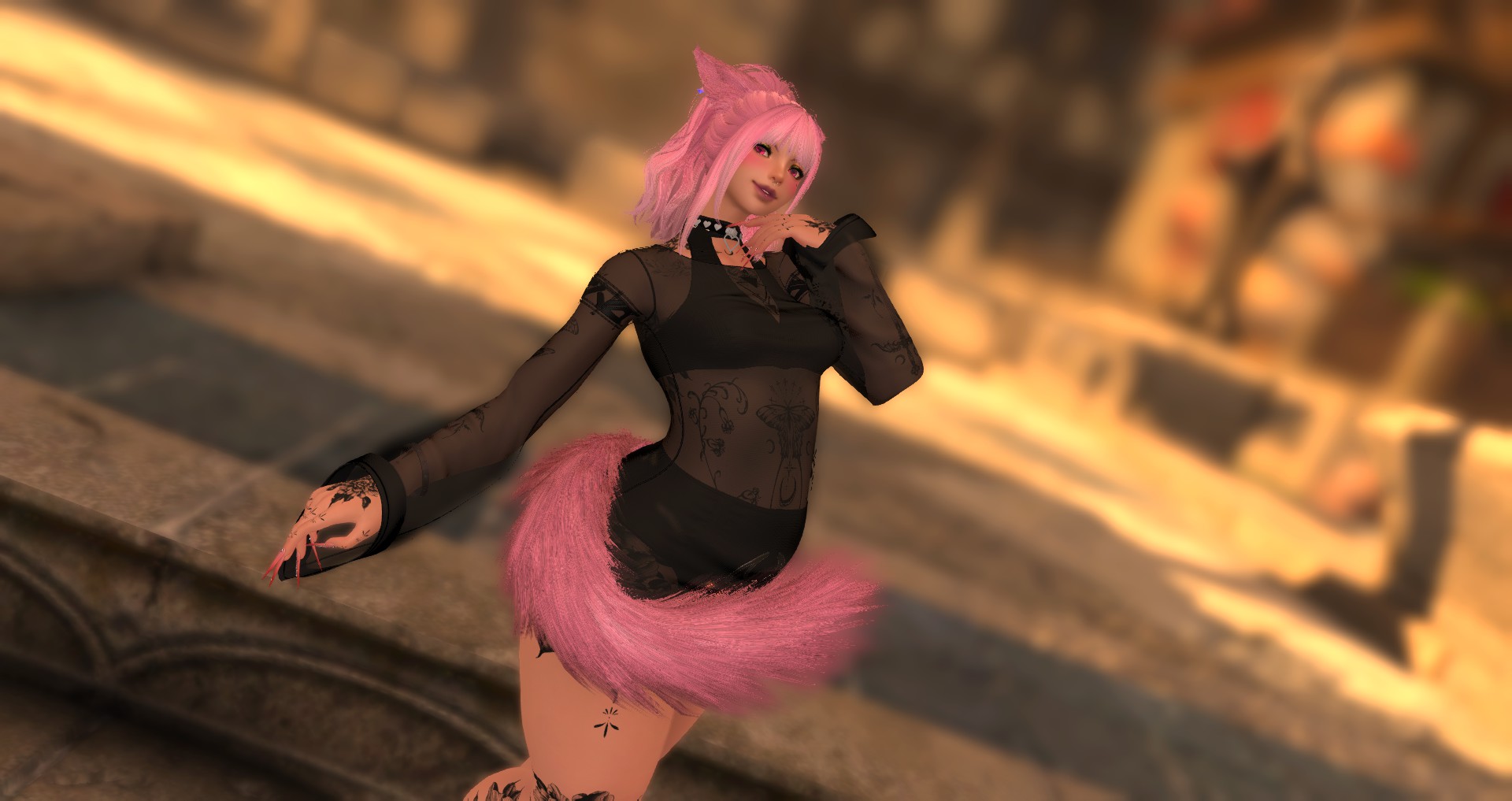 A wandering courtesan, she delights in the pleasures and passions of mortals. Once an ordinary fox, she was transformed into humanoid form by Menphina, the Moon Goddess, who took notice of her innocent fascination with human intimacy. For hundreds of years, she has roamed Eorzea, charming and captivating those she encounters, learning the secrets of desire while maintaining an air of gentle innocence.